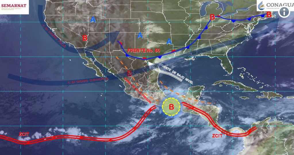 Asimismo, el frente frío número 60 se extenderá como estacionario sobre la frontera norte de México, mientras que canales de baja presión se mantendrán en el interior del territorio nacional.