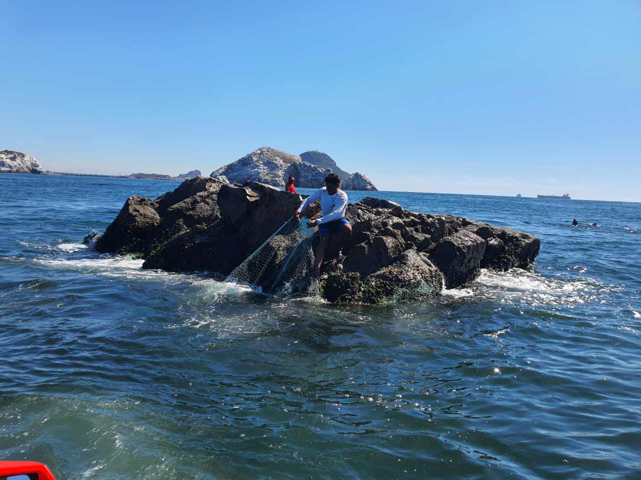 Mazatlán, Sinaloa.- Elementos de la Policía Acuática atendieron una denuncia anónima en la que hacian referencia de una red de pesca que dificultaba a los lobos marinos subir o bajar de la roca donde comúnmente descansan.